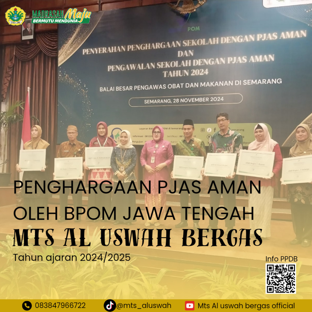 Tujuanya tidak lain ialah untuk memberikan penghargaan-penghargaan kepada sekolah yang memiliki komitmen dalam melaksanakan program keamanan pangan dengan PJAS aman. MTs Al Uswah Bergas merupakan salah satu sekolah yang mendapatkan penghargaan untuk memiliki komitmen dalam melaksanakan program-program guna menjaga keamanan pangan di lingkungan sekolah khususnya koperasi dan kantin sekolah. Sehingga insyaAllah pangan dan jajan MTs Al Uswah Bergas selalu aman dan sehat di konsumsi baik untuk peserta didik maupun warga MTs Al Uswah Bergas.